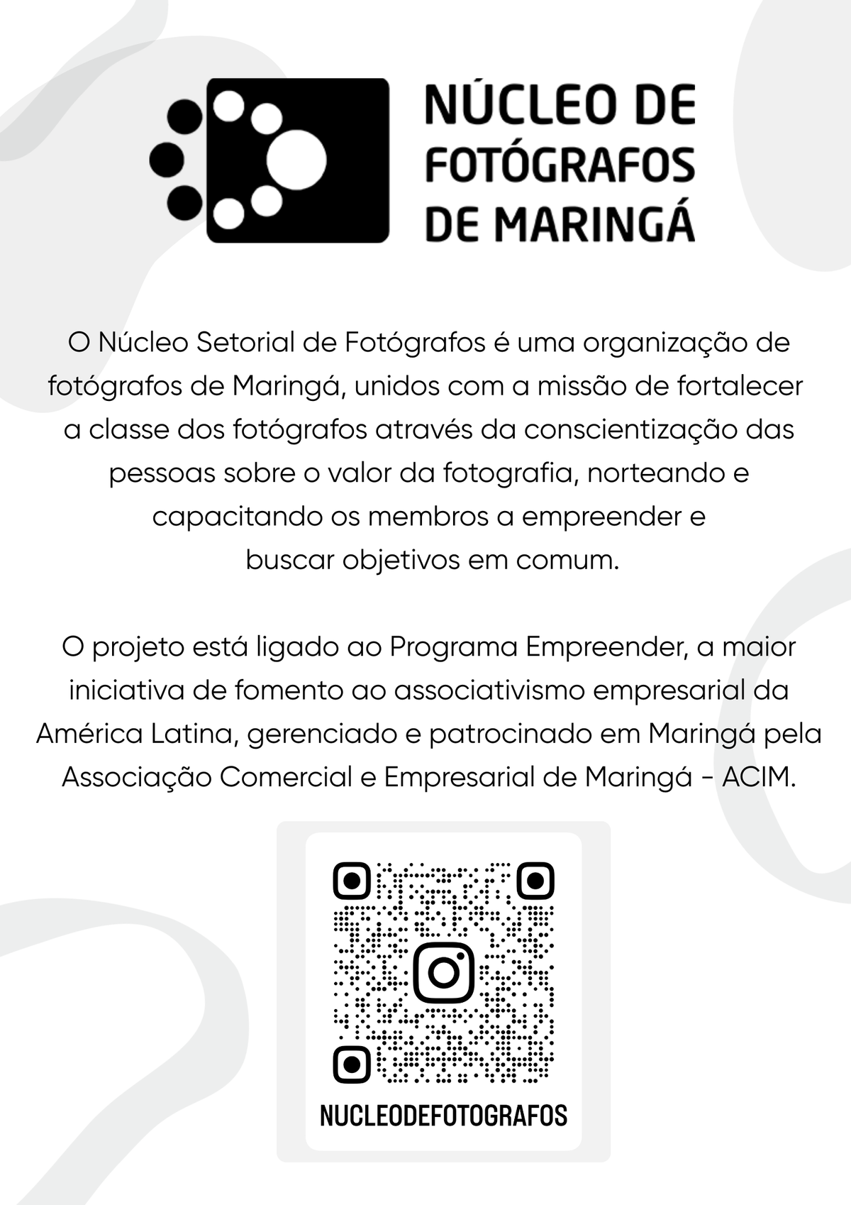 Cada fotógrafo tem uma forma de se expressar através de suas lentes. Nós, do Núcleo de Fotógrafos de Maringá, Apresentamos nossos olhares e sensibilidades, mostrando um pouco do trabalho que realizamos e da nossa arte.